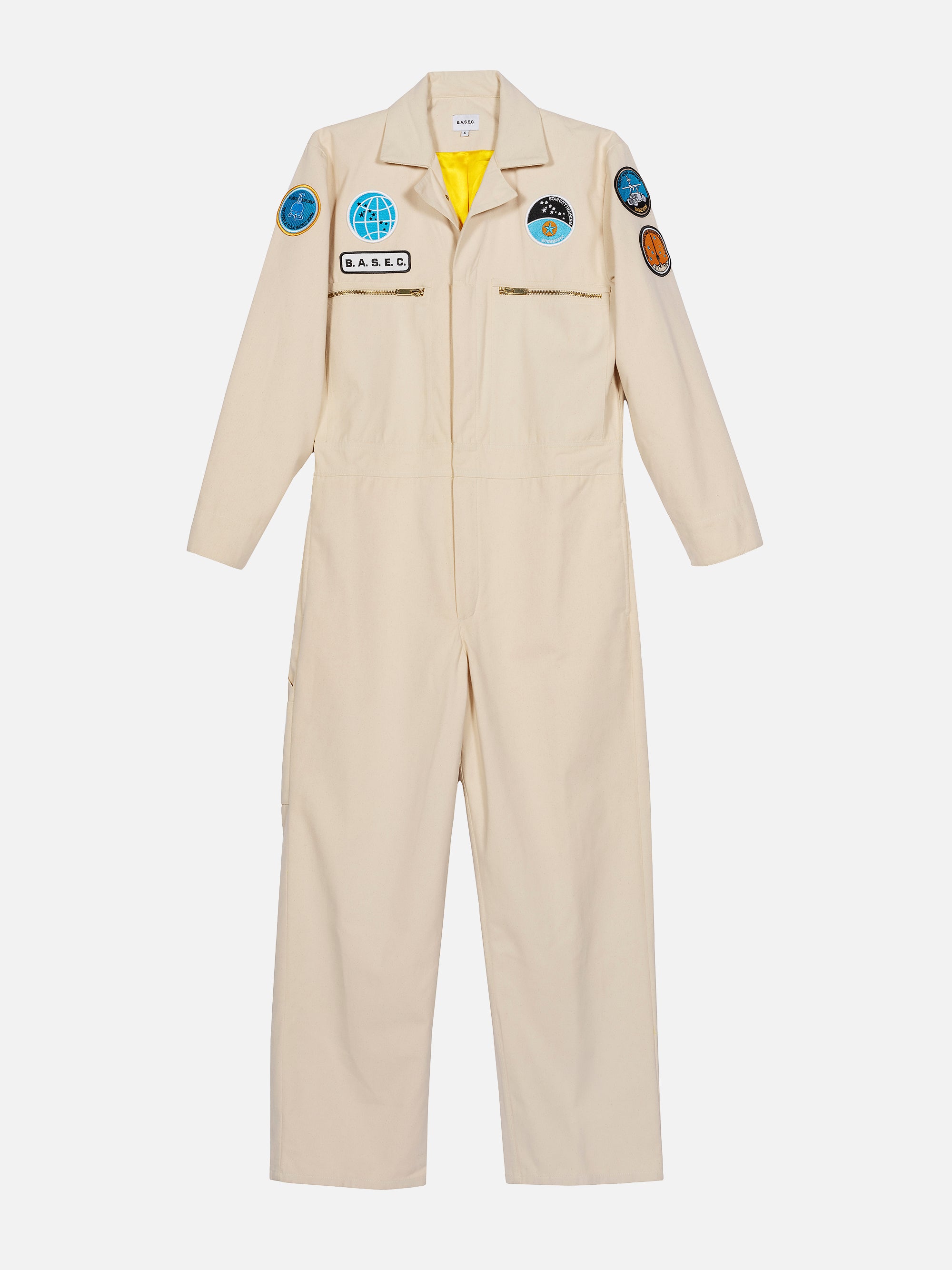 Inspired by the suits worn during astronaut training, this pilot suit featuring B.A.S.E.C.’s iconic patches was designed after Strachan trained as a Russian Cosmonaut in Moscow.