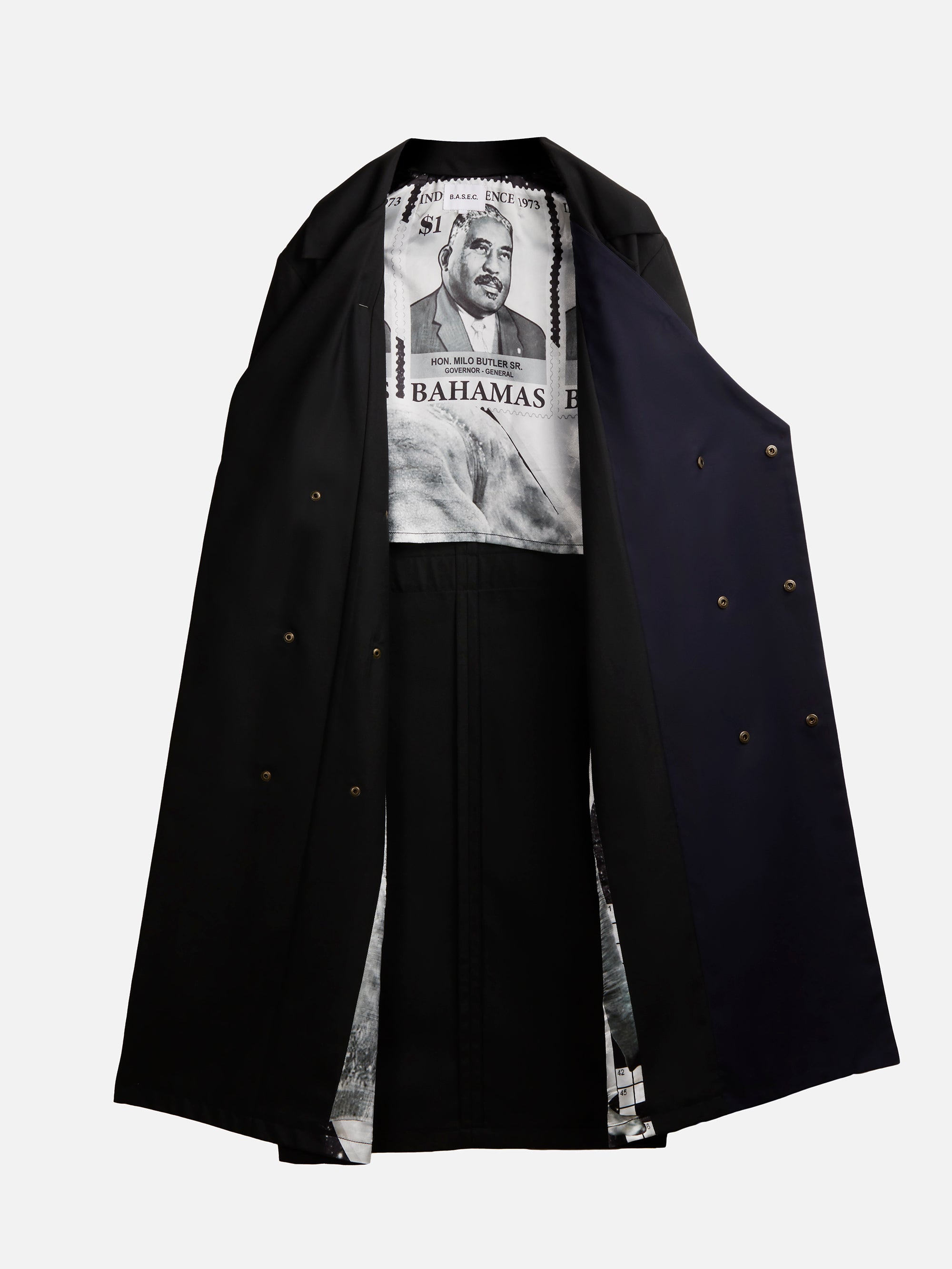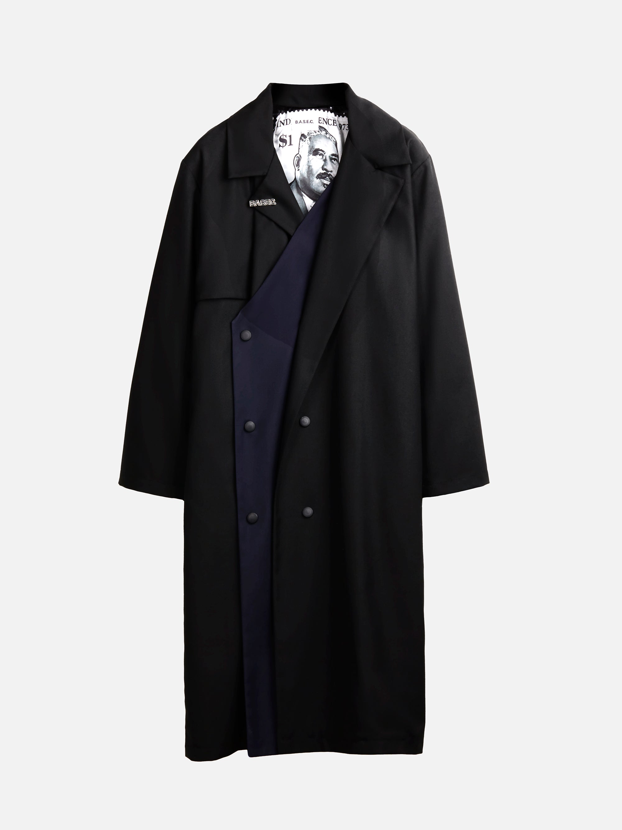 Double Breasted Unisex Trench Coat with silver B.A.S.E.C. pin.